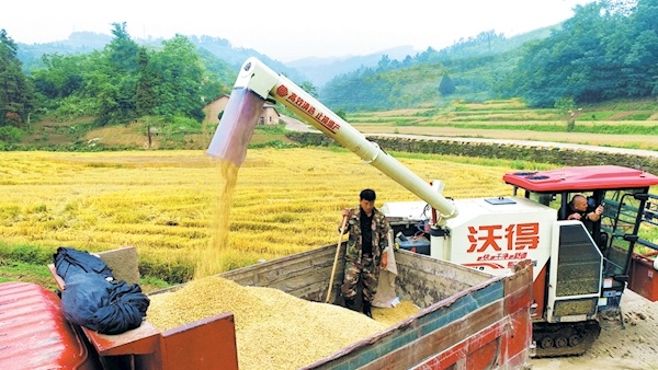6月9日,竹溪县龙坝镇农民使用联合收割机抢收小麦。通讯员王文彬摄