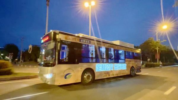 19日晚,一辆会“发光”的13路公交车亮相中心城区街头,成为一道流动的夜景。该公交车车身采用了弱电荧光材料,能摆脱昏暗光源的影响,进一步提升宣传效果。(通讯员 陈岑 摄)