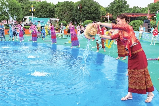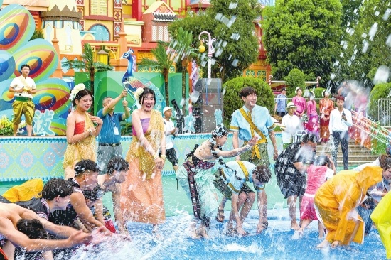 6月22日,荆州方特推出民族泼水大狂欢、梦幻嬉水大巡游、夏日星光夜市、傣夜电音狂欢和夏夜花火大会等系列活动。园区以西双版纳少数民族风情为主题,重点打造了不同特色区域,让游客感受不一样的民俗文化。广大游客沉浸在清爽中,乐享端午假期。(张梦瑶 摄)
