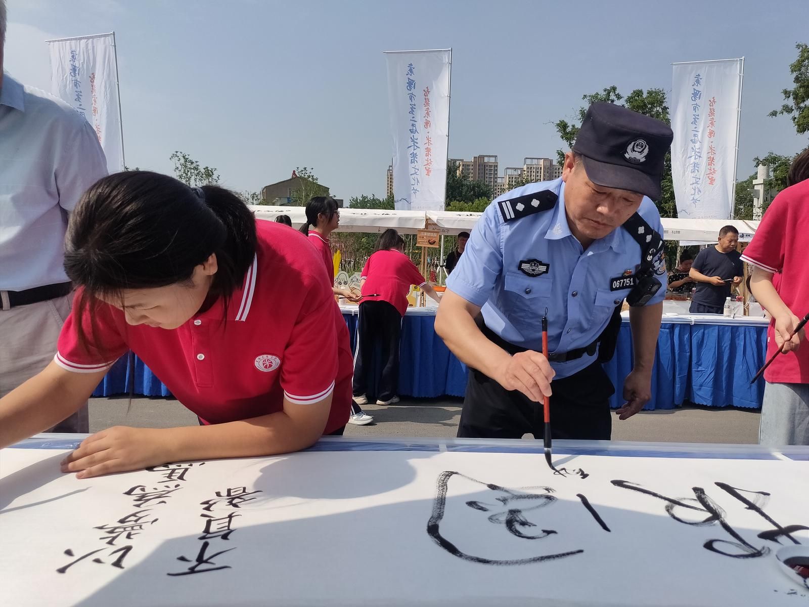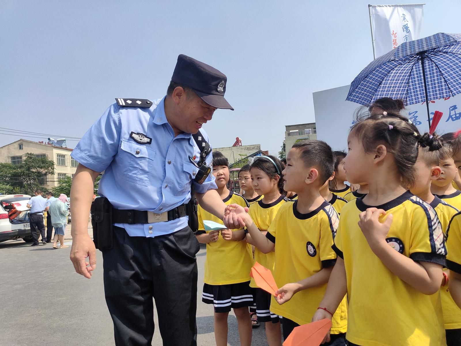 活动现场,民警及时疏导过往车辆,引导规范停车,提醒家长照看好小孩,保管好个人物品。民警和米芾中学的学生一起体验了米芾书法文化,并对参演师生进行暑期防溺水安全教育。