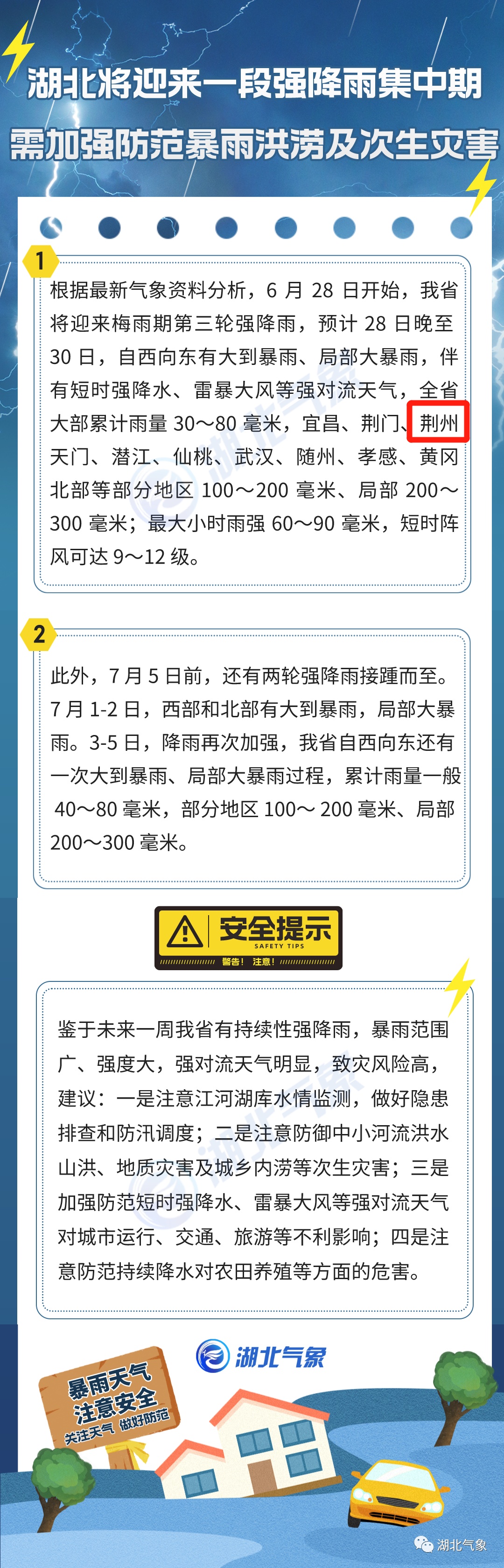 根据最新气象资料分析,预计6月29~30日,荆州市自西向东有大到暴雨、局部大暴雨,并伴有短时强降水、雷暴大风等强对流天气,主要降水时段在29日夜间,过程累计雨量50~100毫米、局部150毫米以上;最大小时雨强60~90毫米,短时阵风可达9~12级。