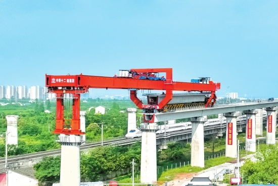 昨日,荆荆铁路4标段项目工地,荆荆铁路跨荆州至马山公路路段,大型架梁机正在进行预制箱梁架设施工。