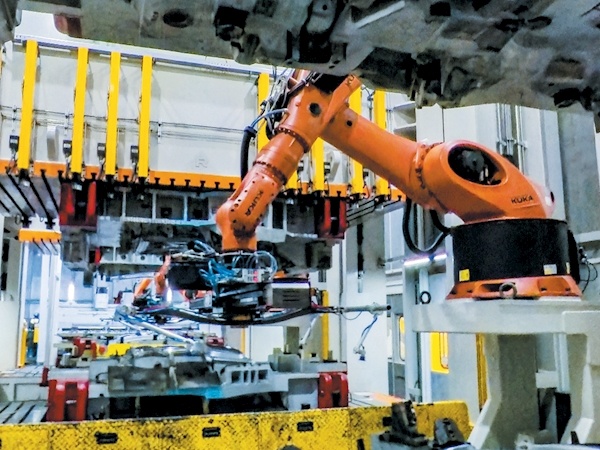 6月26日,在东风小康十堰基地空港工厂生产线上,工业机器人正在制造产品。该工厂引入全球领先的智能喷涂系统和整车总装控制系统,打造国内先进的柔性生产线,既能生产燃油汽车,也能生产新能源汽车,实现冲压、焊装、涂装、总装等整车制造四大工艺全流程数字化、智能化。