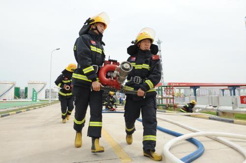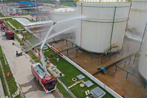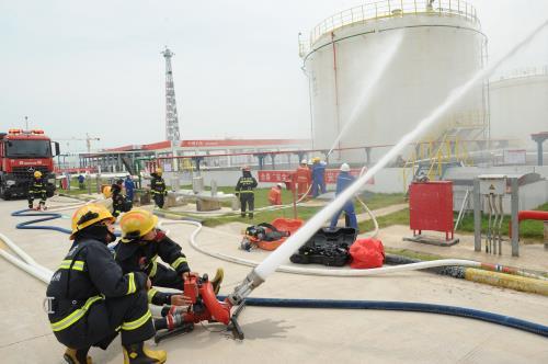 此次演练,模拟油库一个油罐突然渗油,如不及时排险,后果将不堪设想……现场指挥人员按照事先准备的演练预案,立即指令救援组一边排险,一边用高压水枪对油罐进行降温。根据险情重要性,指挥员又紧急通知相关增援组。接警的荆州市消防救援支队沙岑路特勤站4辆消防车同步赶到现场,用高空喷雾水枪等设备进行“火力”压制。10多分钟后,险情全部得到了控制。经报告,此次事故处置及时,反应快速,演练在一片紧张、惊险的实战中宣告结束。