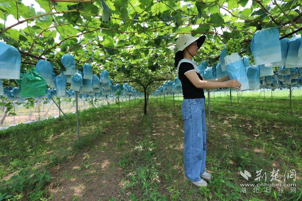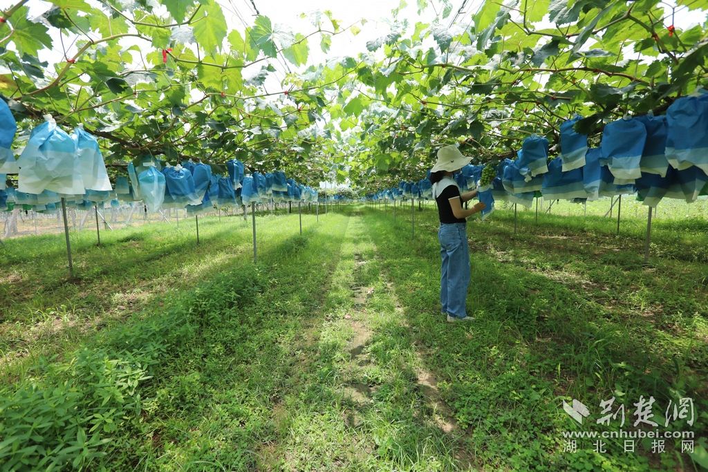 荆楚网(湖北日报网)讯(通讯员李亚隆)2023年7月2日,湖北公安县埠河镇。农民张海燕夫妇单株阳光玫瑰挂果700多串,每串重量在1.5-2斤。