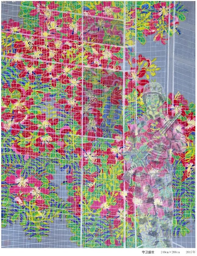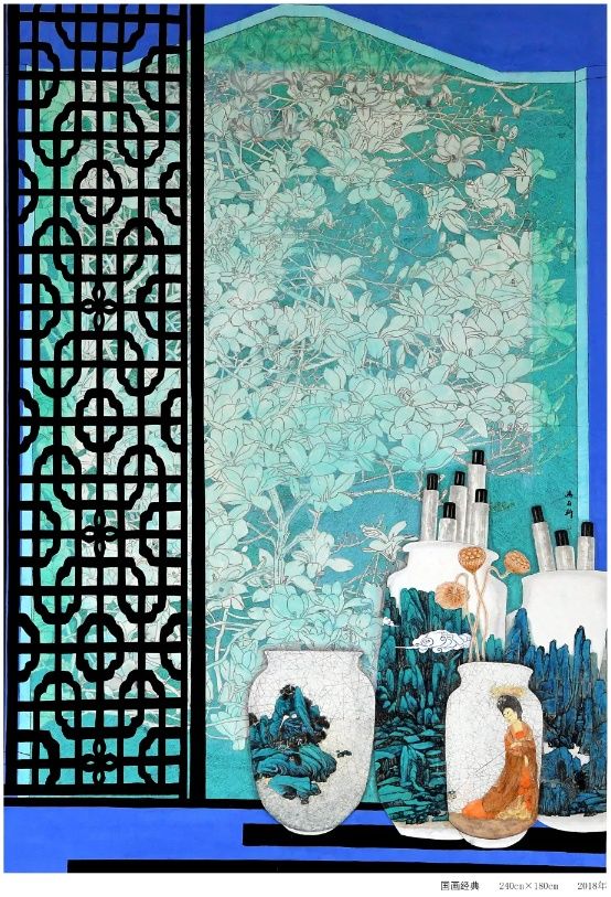 马老师的作品,重彩之中既有传统中国画的色彩表现力,又借鉴了印象派、后印象派、表现主义的优长。同时,对波普艺术、光效应艺术进行了吸收,在中国传统的白描和线描基础上,以色彩作为造型手段,将色和线、笔和墨、气和韵整合到一起,形成“新双勾”和“网格双勾”。