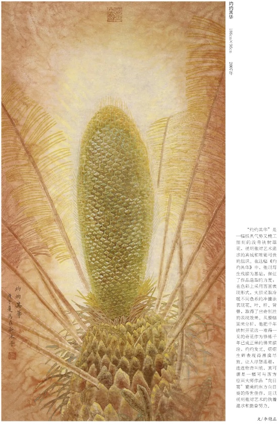 2007年,马老师多次到西双版纳写生,得巨幅作品《灼灼其华》,一改过去经验俗成的创作套路,造型上以实际写生为依据,色彩上吸收西方的表现理念,构图上大胆试用现代的新图式理念,以精工细刻的没骨手法,为人们展现了一幅千年铁树开花熠熠生辉、灼灼光芒的奇丽壮美景象。