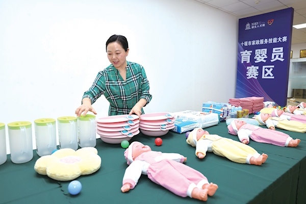 十堰市家政服务职业技能大赛(湖北邀请赛)决赛将于今日举行,全省9个市州25支代表队的150名选手参与此次大赛。昨日下午,记者在位于汉江路十堰市家庭服务领跑者创新产业园的比赛现场看到,各种比赛用具已准备就绪,开幕式舞台以及展台、广告牌等已布置完毕。图/记者 张建波