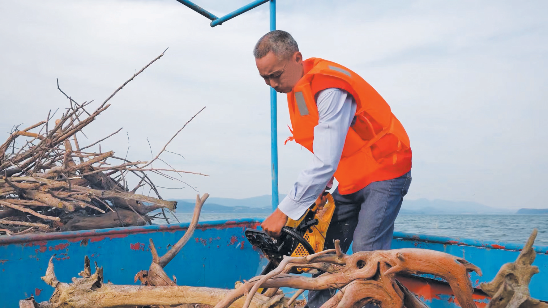 “那咋行?下雨也得干!尤其是汛期下大雨,上游来的漂浮物会更多。”他回忆道,“2021年秋汛,我们每天从天不亮干到太阳下山,十几个小时,回去累得饭都不想吃。”