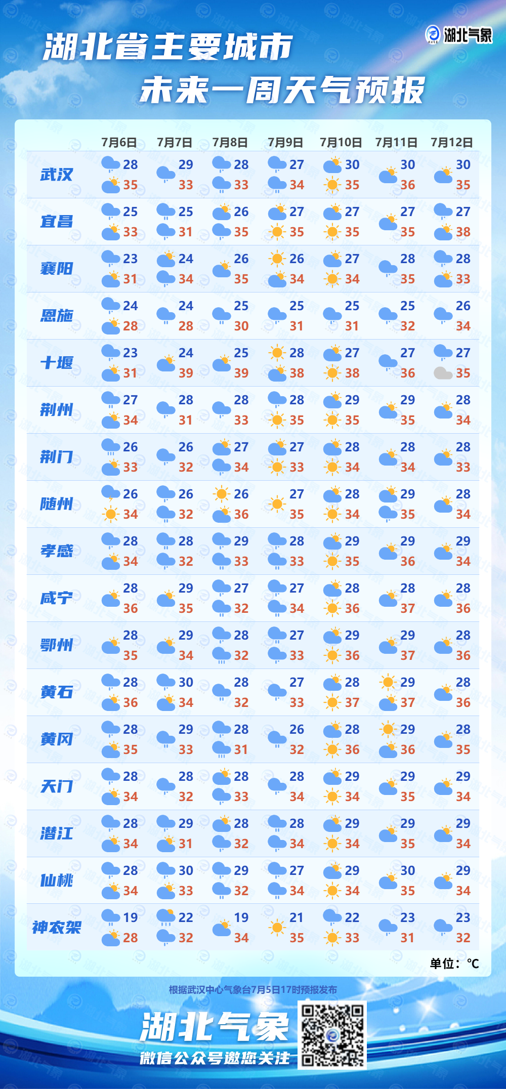 根据最新气象资料分析,预计7月6-8日,湖北将迎来梅雨期第五轮强降水。其中东部、南部有大到暴雨、局部大暴雨,累计雨量一般30~80毫米,恩施、孝感、武汉、荆州、黄冈、鄂州、黄石、咸宁局部可达120~200毫米;最大小时雨强50~90 毫米,局部短时阵风可达9~11级。
