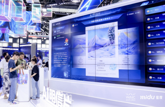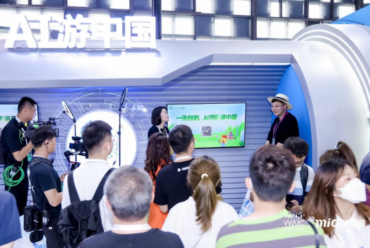 不仅诗歌画作可以“秒级”完成,观众与风景名胜的“合拍”也可智能生成。蜜度旗下AI小画家——蜜小豆经过全新升级,在WAIC现场为观众打造虚拟旅行的影像记录。在“AI游中国”互动中,只需在现场完成一张自拍,蜜小豆就能快速生成观众置身旅行胜地的照片与视频。除了实现与不同风景名胜及地标建筑的“合拍”之外,蜜小豆还在互动中加入了动漫、插画等不同视觉风格,为观众带来一段精彩纷呈的虚拟旅行。