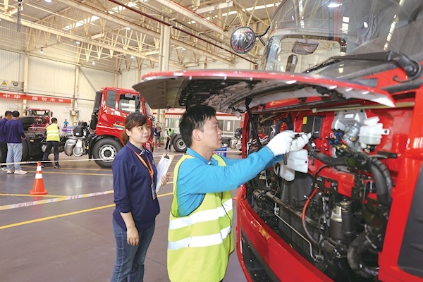 昨日上午,中国技协城市主产业职业技能(十堰)联赛在我市盛大开幕。开幕式结束后,中国技协城市主产业职业技能(十堰)联赛汽车装调工竞赛开赛,来自北汽福田、上汽大通、一汽解放、中国重汽、东风汽车等重型汽车制造厂商的18支代表队、120多名重卡装调高手现场切磋。图/记者 张建波