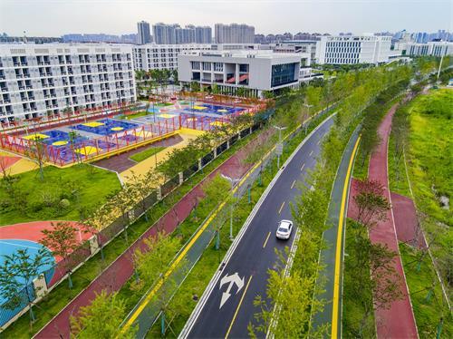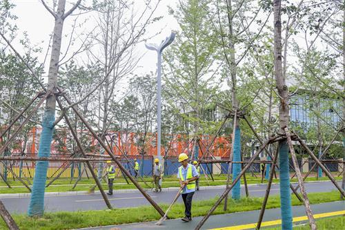 7月7日上午,无人机航拍下的曲江路,层次饱满的乔木高低错落,色泽艳丽的跑道与绿意盎然的草坪相映成趣,工作人员正在进行人工打草及绿植养护工作。