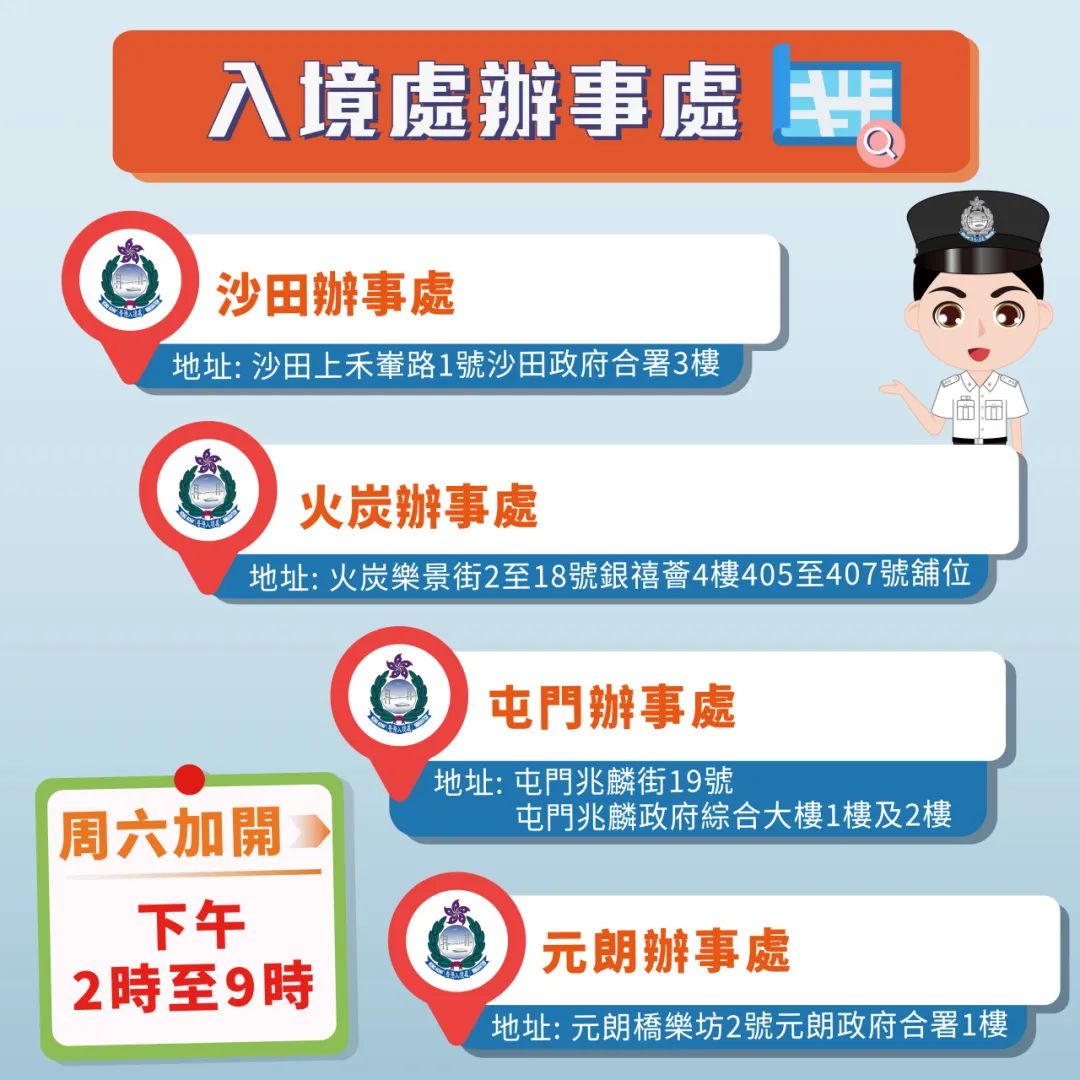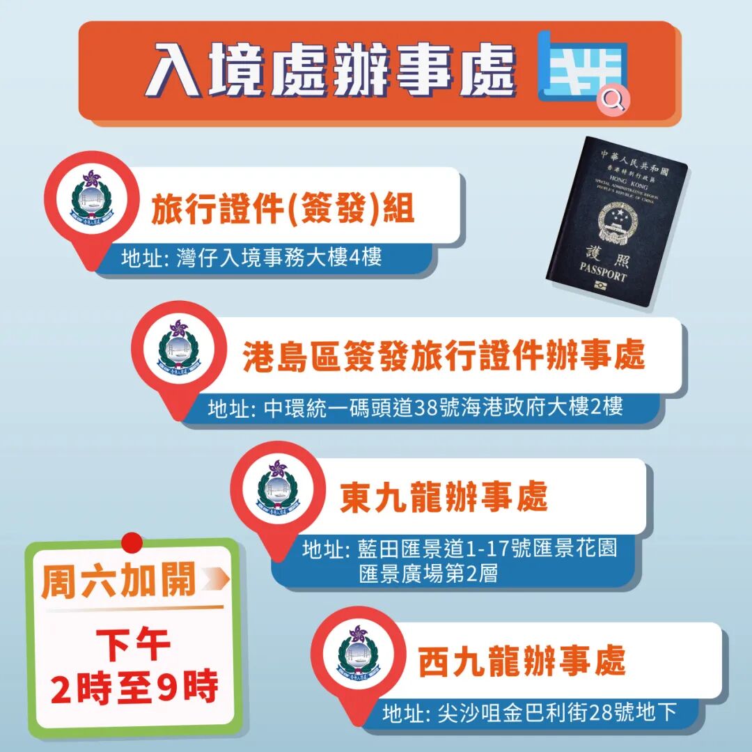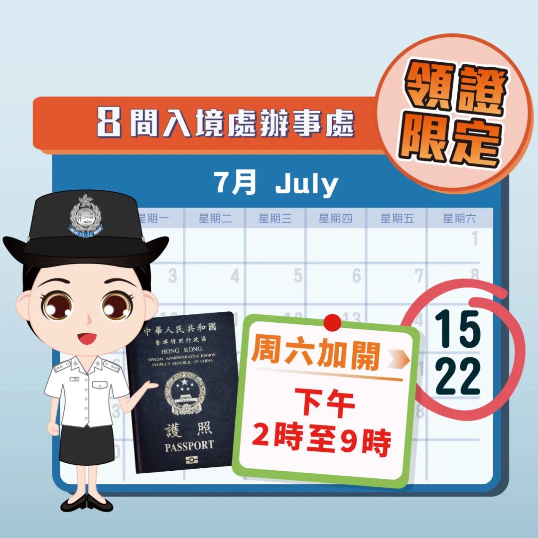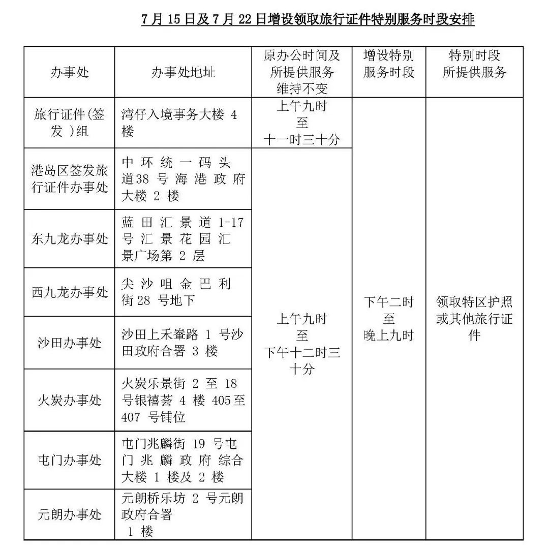 香港入境事务处宣布,位于湾仔入境事务大楼四楼的旅行证件(签发)组及七间分区办事处7月15日(星期六)及7月22日(星期六)下午二时至晚上九时,增设领取旅行证件特别服务时段。