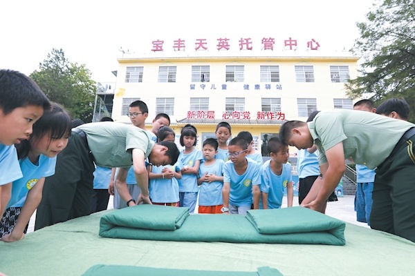 7月15日,在竹山县宝丰镇天英托管中心院,退役军人正在教孩子们整理内务。“八一”建军节临近,宝丰镇退役军人服务站组织退役军人到天英托管中心院,为留守儿童开展为期一周的国防教育,宣讲国防安全知识,现场教授站军姿、内务整理等内容,让热爱国防的种子在孩子们心中生根发芽。
