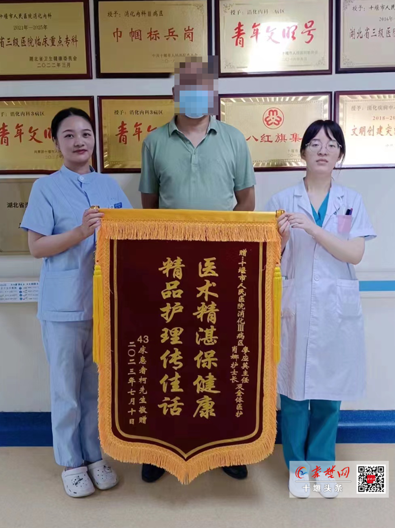秦楚网-十堰头条讯 记者 吕鑫 特约记者 马婷婷 通讯员 张珊珊 报道:因为没时间,男子硬扛着肠胃不适许久没有治疗,偶然到十堰市人民医院就医,消化内科三病区专家团队以日间手术治疗模式当天完成治疗,次日即办理出院,把住院手术治疗做成了“门诊”的效率。近日,完全康复的患者拿着锦旗向三病区全体医护人员表达感谢。