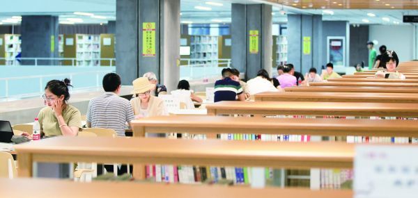 7月13日,荆门市图书馆内读者众多,选书、看书、借书的人络绎不绝。随着我市持续高温,到图书馆等室内场所看书、学习充电成了不少市民度夏避暑的选择之一。(记者 郑波 摄)