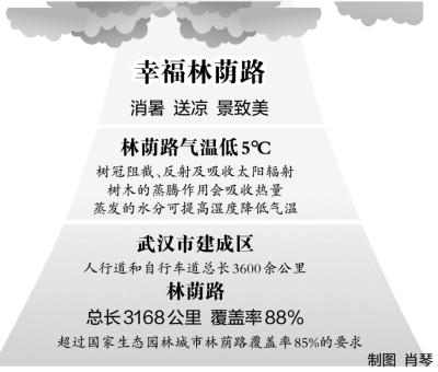 在武汉,像后襄河南路这样的林荫路不在少数。住建部遥感应用中心遥感调查数据显示,截至目前,武汉市建成区人行道和自行车道总长为3600余公里,其中林荫路总长约3168公里,林荫路覆盖率达88%。这一数值已超过创建国家生态园林城市需要达到“城市林荫路覆盖率85%”的指标要求。