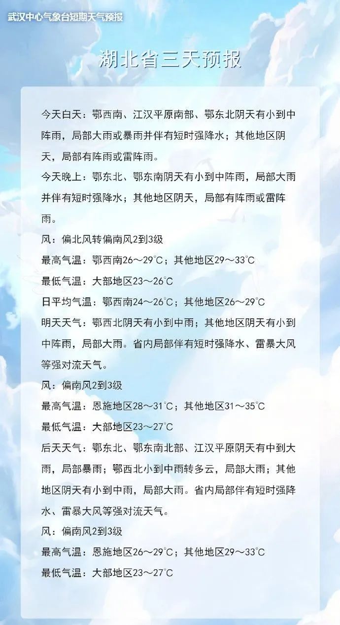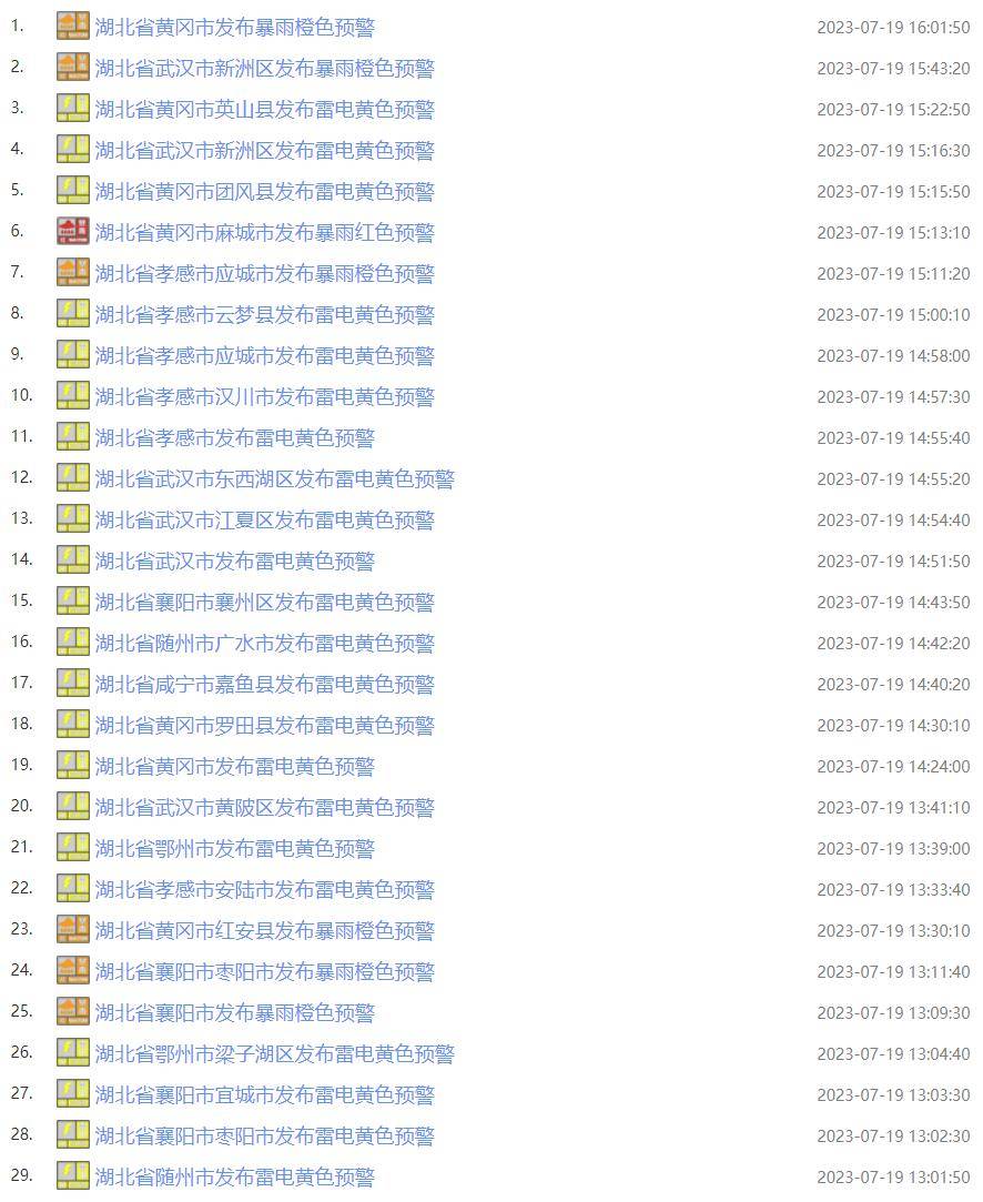 7月19日,武汉、黄石、黄冈、咸宁、孝感等湖北多地发布雷电黄色预警、暴雨橙色预警,请注意防范。