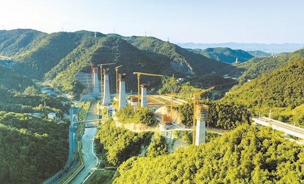 7月17日,记者拍摄的西十高铁神定河特大桥施工现场。该桥全长841.05米,是一座大跨度连续钢构桥,是西十高铁全线最高桥,也是湖北段六个重难点工程之一。“来时青山绿水,走时绿水青山”,施工单位在施工过程中始终坚持环保理念,做到环境保护与工程建设同规划、同施工,全力打造绿色高铁。记者 刘昆 摄