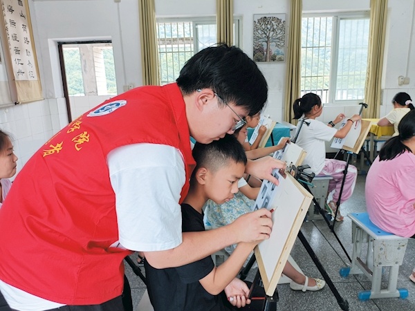 7月18日,汉江师范学院外国语学院向阳花志愿服务队的大学生志愿者在郧阳区鲍峡镇中心小学少年活动中心,为放暑假的孩子们上绘画课。该服务队共有11名大学生志愿者,7月16日以来,他们分别开设舞蹈、书法、象棋、乐器演奏、手工制作、绘画等课程,丰富学生假期生活。通讯员 鲍军 摄