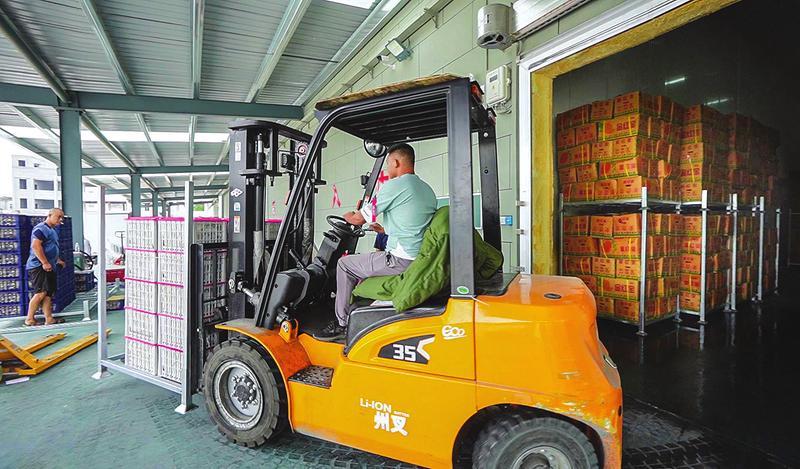 水果在常温下难以长时间保存,冷库是必不可少的储存场所。当天,在位于该村的随县汇满隆果蔬产业园看到,七八辆大型水果货车正在进行装卸,新鲜的水果被工人挑拣后搬上叉车,然后运进冷库(如图)。