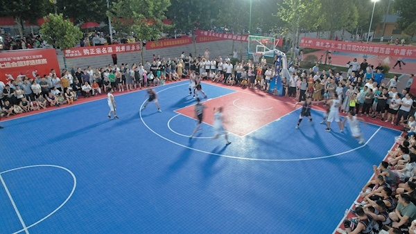 “球给中锋!”“单打他!”“好球!”……赛场上,球员们拼得大汗淋漓。“凉皮凉面、蛤蟆咕咚、冰镇酸梅汤,快来尝一尝!”……赛场外,商贩们一字排开,吆喝起来。