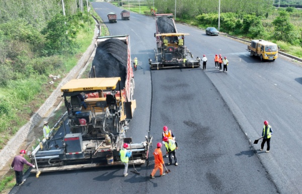 昨日,浩吉铁路沙洋站至342省道集疏运道路施工现场一派繁忙景象,施工人员正在摊铺沥青上面层。据了解,集疏运道路北起浩吉铁路沙洋火车站货场南门,南至342省道,全长1.265公里,总投资3166万元,设计速度60公里/小时,双向四车道一级公路(集散功能)标准,路基宽度为24.5米,预计今年8月完工。(记者 朱俊波 通讯员 李俊 摄)