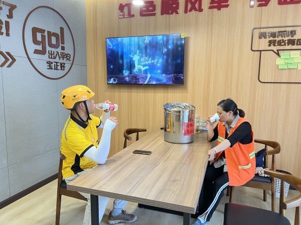 “贴上纳凉点标识后,除了我们骑手,居民也多了起来,社区还新增了爱心冰箱、酸梅汤、降温解暑药品等,对我们和居民来说更方便了。”美团外卖中天街三站队长贾代凡说。