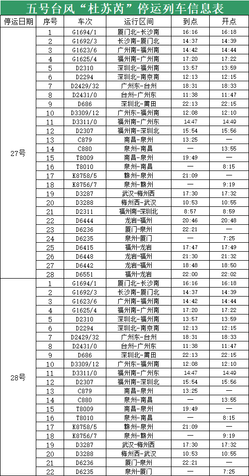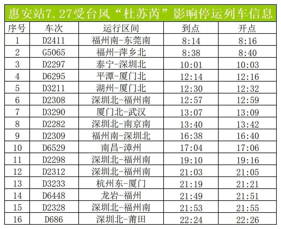 受台风“杜苏芮”影响,为确保铁路运输安全,7月27日起,福建、广东、长三角铁路部分列车停运。其中武汉到厦门、梅州等地的多趟列车受影响。