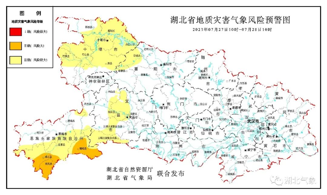 据湖北气象消息 ,2023年7月27日10时—7月28日10时,预计三峡库区(兴山东部、秭归东部、夷陵),十堰(十堰市城区、郧西东部、郧阳、竹溪、竹山、房县、丹江口)、襄阳(谷城、保康北部)、宜昌(宜昌市西部城区、长阳中部和南部、五峰)、恩施(恩施市南部、巴东中西部和南部、建始东北部和南部、利川南部、咸丰、宣恩、鹤峰)以及其他强降水区域发生崩塌、滑坡、泥石流的风险较大;其中,恩施(咸丰南部和东部、来凤、宣恩西南部、鹤峰大部)发生崩塌、滑坡、泥石流的风险大。