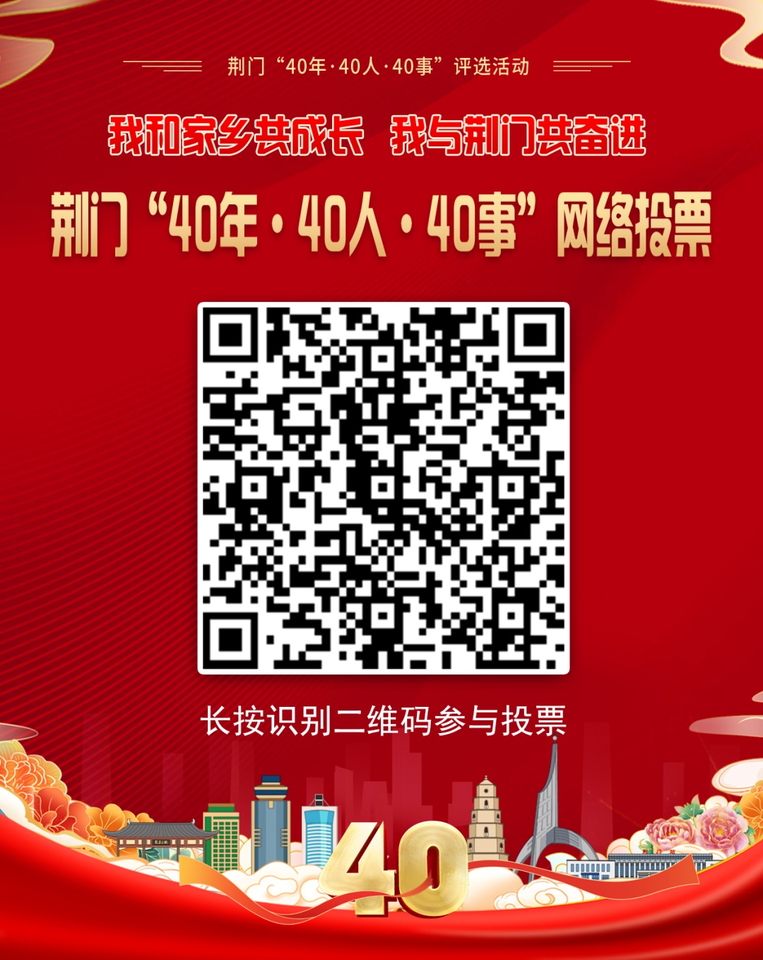 值荆门建市40周年之际,为大力弘扬艰苦创业、实干兴市、创新包容、共建美好的社会新风,生动展现40年来全市人民凝心聚力、接续奋斗取得的伟大成就,市委、市政府在全市范围内开展荆门“40年·40人·40事”评选活动。