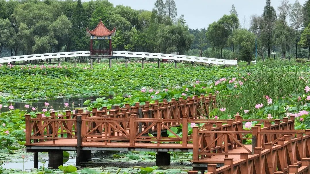 蜿蜒曲折的石木栈道把满池荷塘包围其中