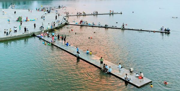 7月31日傍晚,荆门凤凰湖湿地公园热闹非凡,不少市民在这里亲水、游泳。盛夏时节,骄阳似火,人们纷纷寻找身边的消暑好去处,或在水库游泳、或在山间小溪戏水,享受大自然的清凉。游泳除了能消暑解乏,还能锻炼身体,已成为不少市民夏天的首选。(记者 朱俊波 通讯员 严安国 摄)