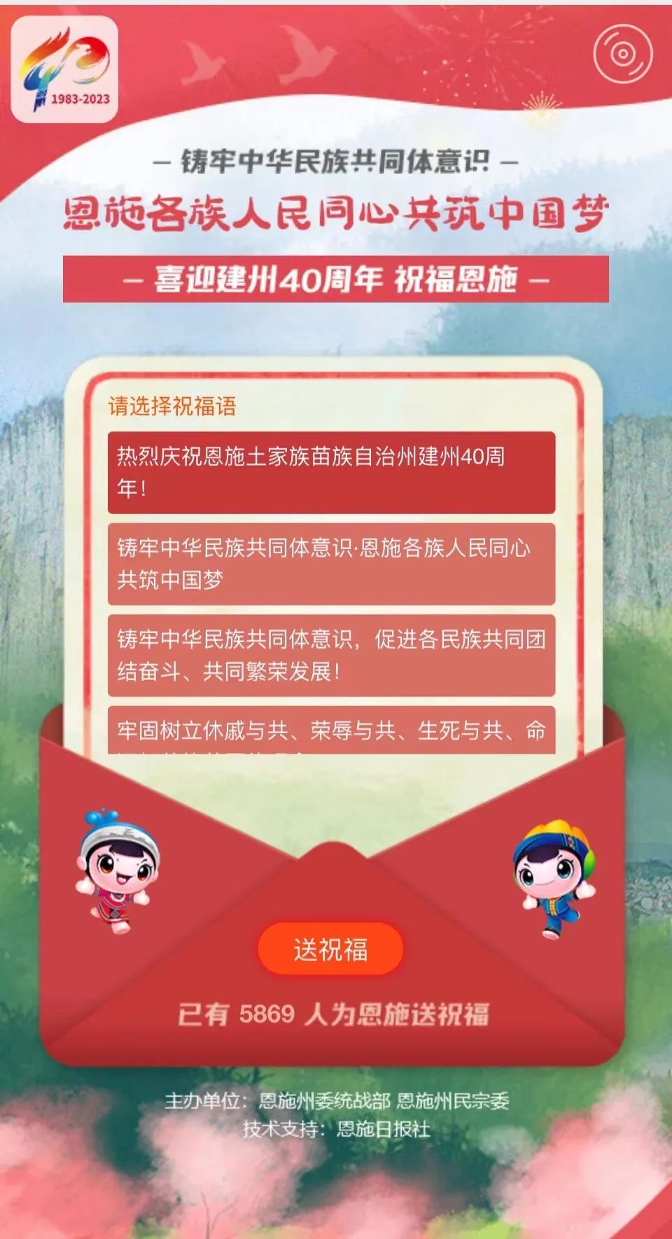 为喜迎恩施州建州40年讴歌伟大时代,充分展示党的民族政策和民族区域自治制度在恩施的生动实践,营造全民参与、全民祝福的热烈氛围,凝聚发展正能量,恩施州委统战部、恩施州民宗委联合道中华微信公众号共同开展“喜迎建州40周年·‘道中华’祝福恩施海报网络接力”活动。