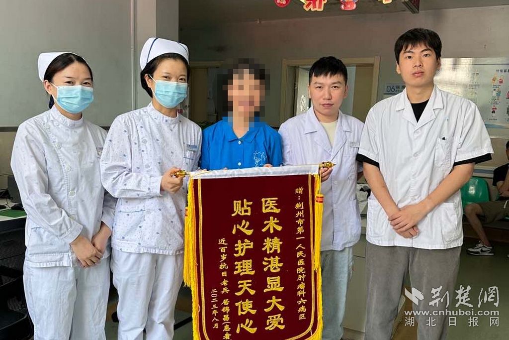 荆楚网(湖北日报网)讯(通讯员杜川)8月1日,在建军节这个特殊的日子里,97岁高龄的抗战老兵居爷爷及家属为荆州市第一人民医院肿瘤科六病区送来了写有“医术精湛显大爱,贴心护理天使心”的锦旗,向医护人员深深表达诚挚的谢意,感谢肿瘤科六病区医护团队精心的治疗和卓越温馨的服务。