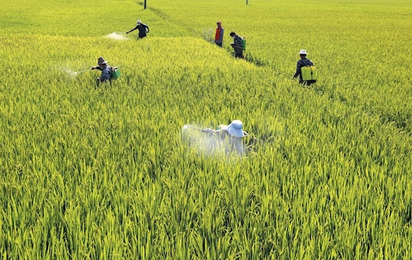 8月4日,竹山县宝丰镇农业技术服务推广中心技术人员深入双庙村,指导村民防治稻飞虱、稻纵卷叶螟病虫害。据悉,入夏以来,该镇成立水稻病虫害防治领导小组,及时组织农业技术人员进村入户当好“田保姆”,确保今秋实现丰收。