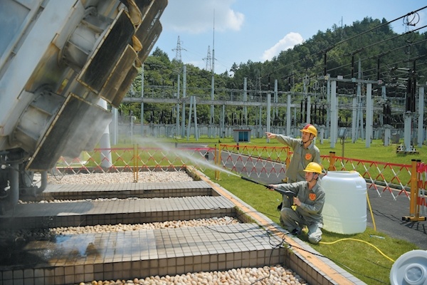 本报讯 通讯员 赫金鑫 姜婷婷 姚莉 报道:8月2日,在220千伏伏龙虎沟变电站内,国网十堰供电公司电力运维人员在烈日下对1号主变压器进行喷淋降温(如图)。蒸腾的热浪让人窒息,汗水从他们额头淌下,每个人的衣服湿了又干、干了又湿,贴在身上都结起了盐巴。