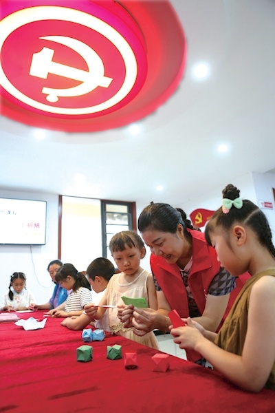 五堰街道北街社区暑托班里,社区工作者义务教孩子们做手工。