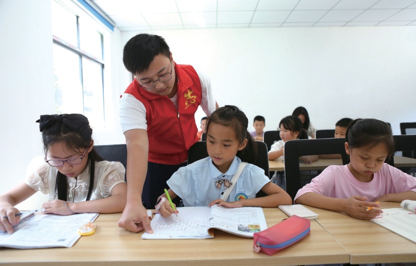 花果街道丁家村暑托班里,大学生志愿者辅导孩子们学习。