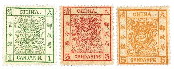 1878年,清朝政府在北京、天津、上海、烟台和牛庄(营口)等五处设立邮政机构,附属于海关内。上海海关造册处当年即印制以龙为图案的一套3枚邮票发行,邮票正中绘一条五爪金龙,衬以云彩水浪,邮票的颜色和面值不同。这是我国第一套正式邮票,集邮界习惯称为“海关大龙”,简称“大龙邮票” “大龙邮票”为铜质版模,雕刻家用手工逐枚刻制,由于进口纸张不同的缘故,分三次印刷发行。