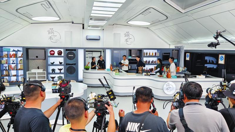 8月9日,中央广播电视总台《一馔千年》节目组在随州各拍摄点调试灯光、完善布景,摄像机走位彩排,为正式拍摄录制做好充足准备。图为摄制组在“饕餮号”智能厨房内彩排。 (随州日报全媒记者 徐斌摄)