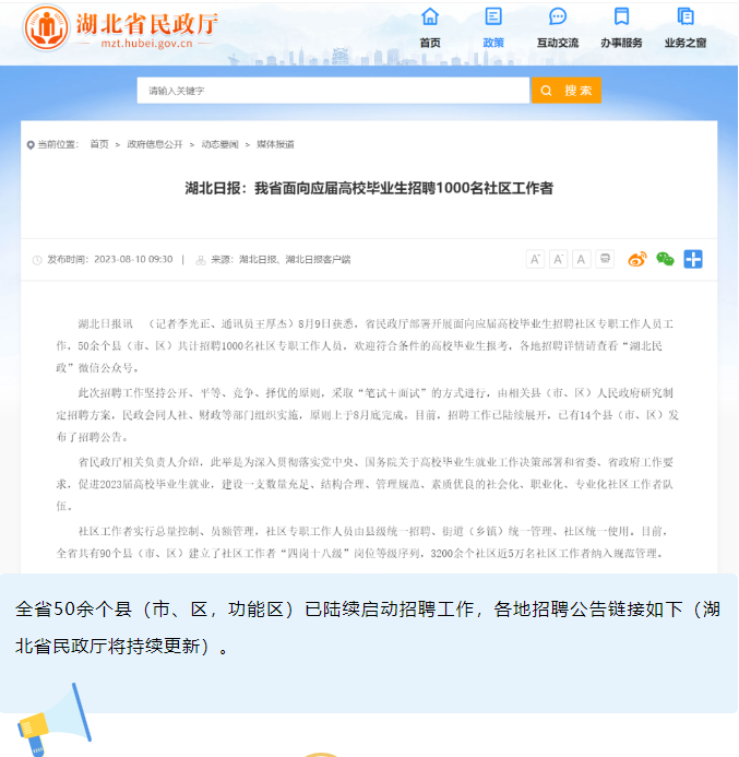 湖北省民政厅部署开展面向应届高校毕业生招聘社区专职工作人员工作,50余个县(市、区)共计招聘1000名社区专职工作人员,欢迎符合条件的高校毕业生报考。