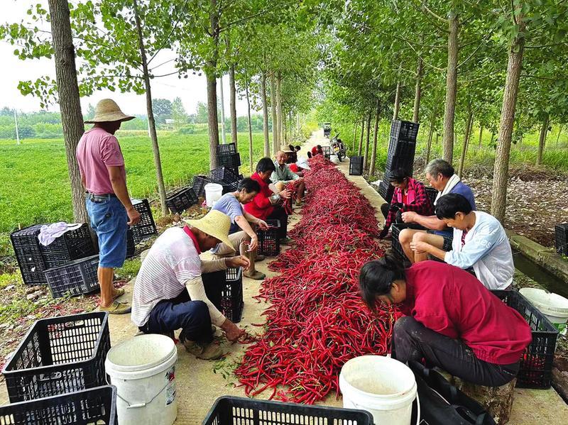 “你看看我摘的线椒,又大又红,等老板来收的时候,肯定能有个好价钱”“我摘得才大嘞,不信咱俩比比看”……初秋时节,农户们围坐在堆积成小山的线椒周围,抓紧时间完成分拣装箱工作。在一片欢声笑语中,随县澴潭镇涢阳村迎来了线椒的第二场大丰收。