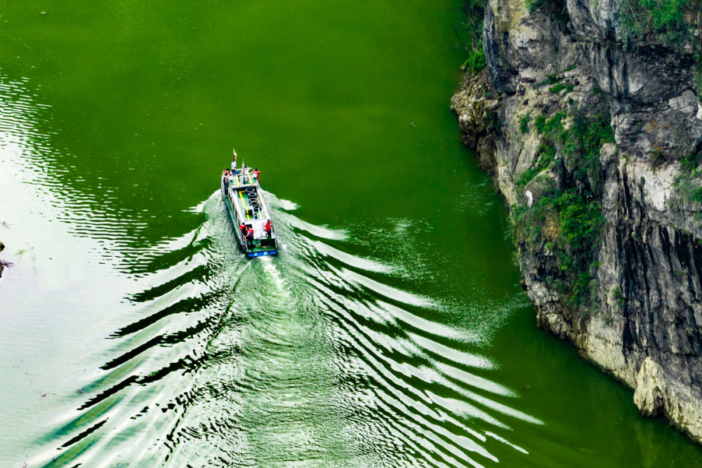 以上图片:2023年8月7日,游客在湖北省利川市文斗镇乘船欣赏郁江风光。CICPHOTO/冉建秀 摄