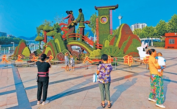七夕节临近,郧西县七夕文化广场布置大型主题花坛,吸引游客和居民拍照打卡。通讯员陈鑫金摄