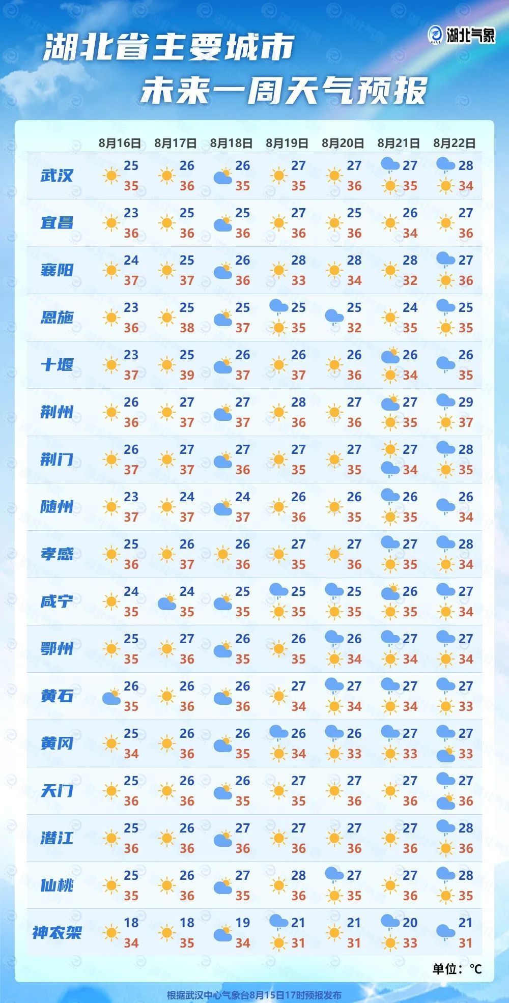近期省内高温将再度加强,建议大家尽量避免在中午时段外出,户外活动做好防暑降温措施,及时补充水分,同时鄂东等地需警惕局地短时强降水等强对流天气可能引发的次生灾害。