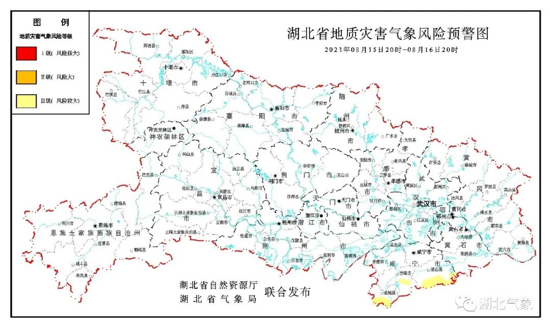 2023年8月15日20时—8月16日20时,预计咸宁(通城南部、崇阳中东部、通山南部和东南部)以及其他强降水区域发生崩塌、滑坡、泥石流的风险较大。