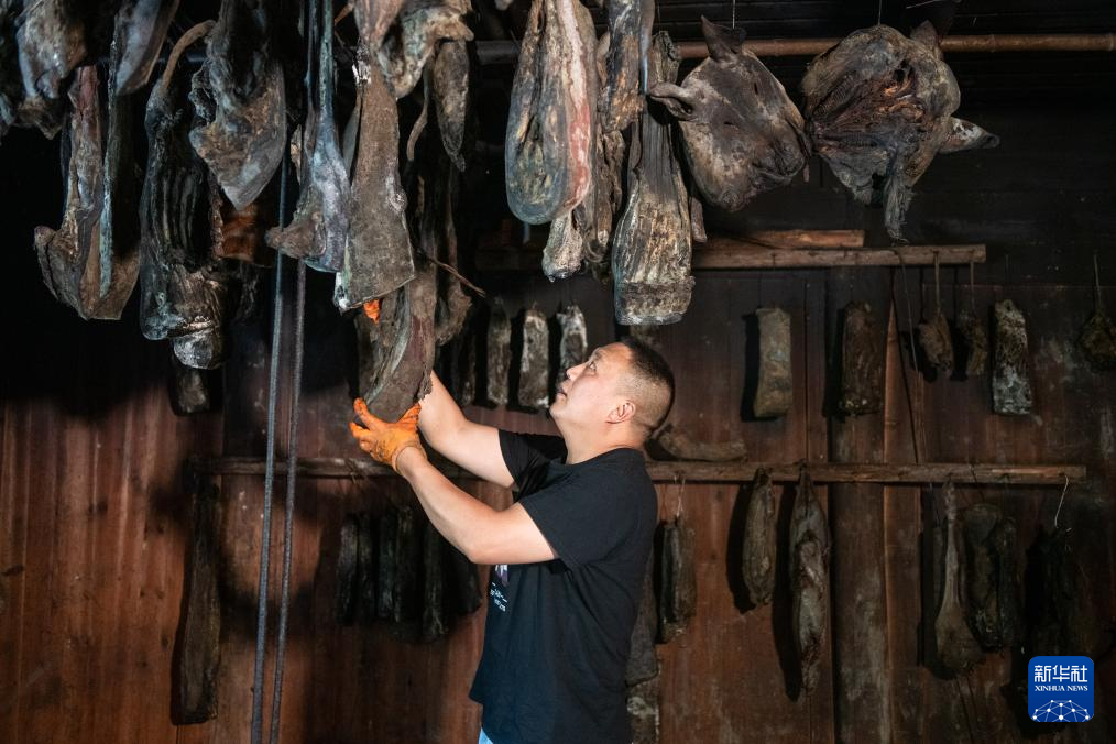 下坪乡东洲村村民田一民在家中整理腊肉(8月17日摄)。田一民和两个兄弟一起,围绕自家的院落,打造“三兄弟腊肉”土特产品牌,并通过网络把村里的土家腊肉、茶叶等特色农产品卖出大山。