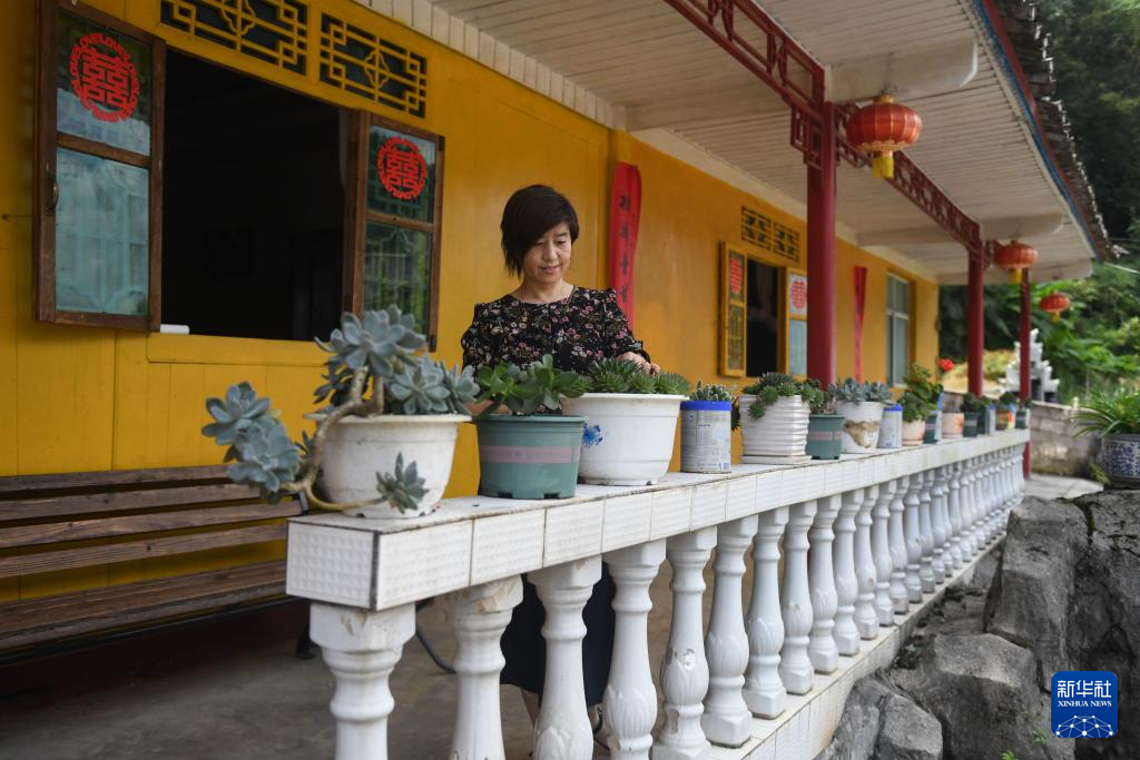 下坪乡东洲村村民李双银在自家的“鲁家大院”里整理花草(8月17日摄)。